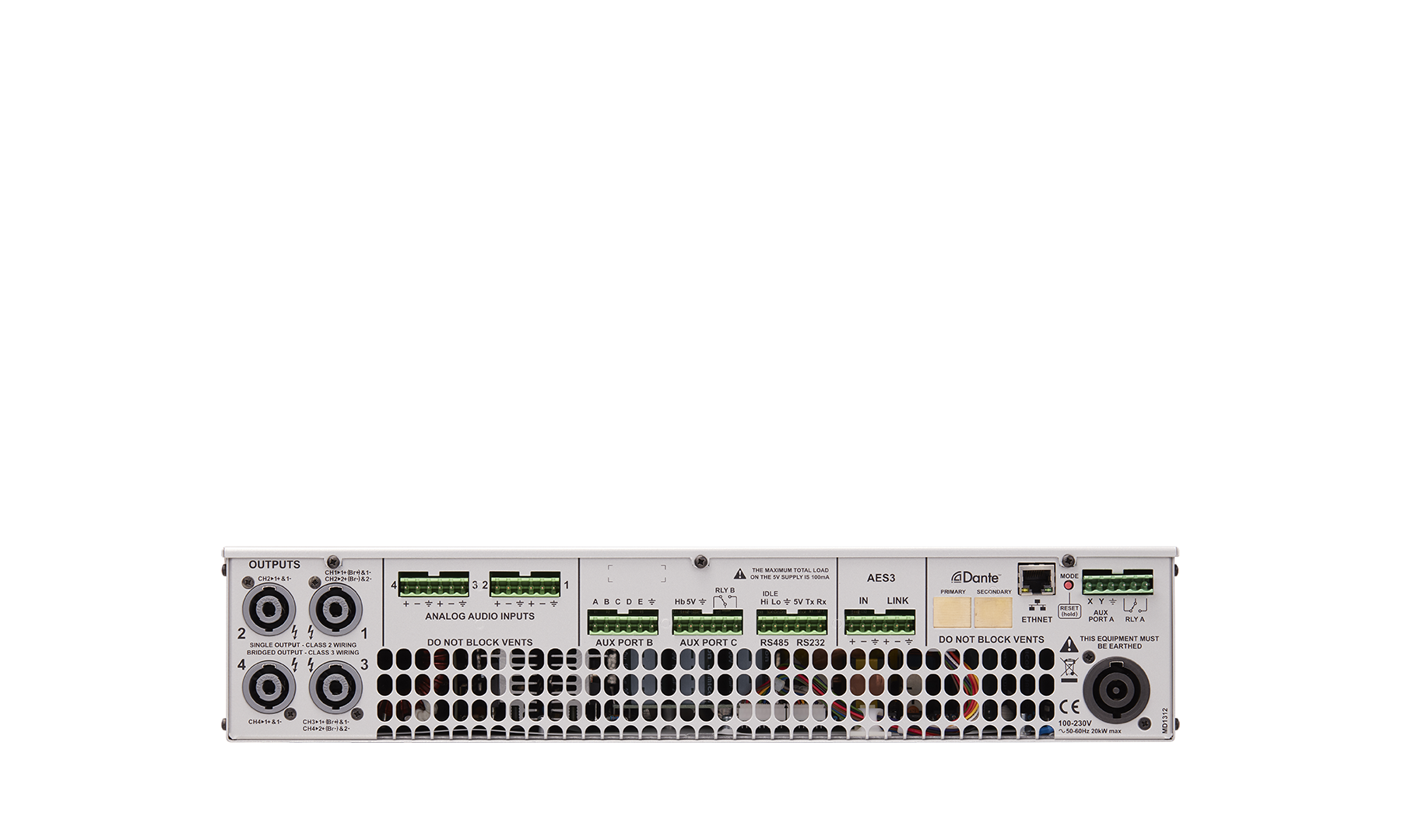 Uniquely each channel can be optimized to deliver its power into 2, 4 or 8 Ohm nominal loads as well as 25V, 70V & 100V constant Voltage (CV) lines. This offers designers and integrators unparalleled flexibility and cost-effectiveness. Using state of the art components and a finely optimized design results in generous power reserves that ensure pristine sound quality is maintained even under the most extreme conditions.